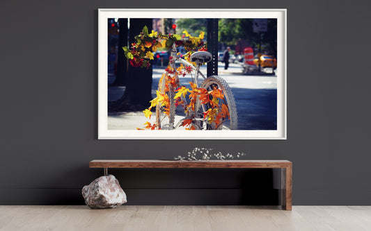 Autumn Awakening: White Bicycle Amidst Fall's Embrace - Seasonal Wall Art- Modern Mood Wall Accent Photo Print Poster