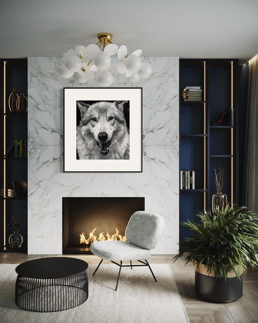 Alpha Stare Black & White Wolf Portrait | Fine Art Wildlife Print by Gil Stunner | Office, Lodge Decor, Cabin Wall Art, Nature Poster
