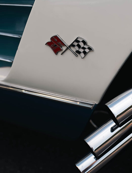 Fine Art Print - Hotrod Corvette with Side Pipes - Racing Flag, White Blue - Gift for him, Garage Decor ideas, Vintage Americana Decor