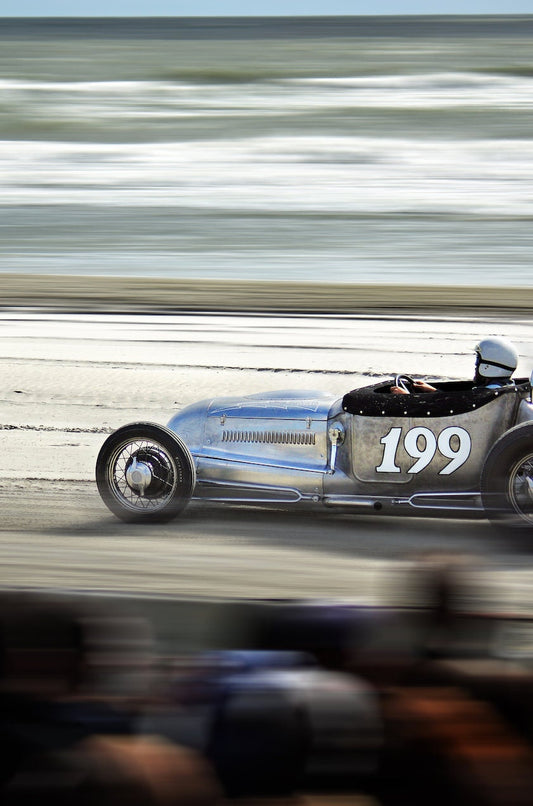 Beach Drag Race Art Print: Chrome Rat Rod #199 Amidst Ocean, Beach, Sand - Perfect Fusion of Vintage Americana
