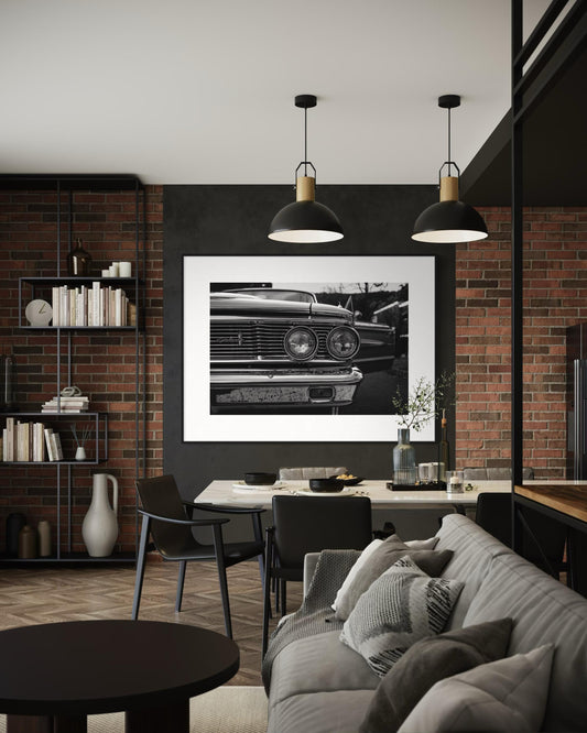 Fine Art Print - Black White Ford Galaxie Wall Art, Classic Americana Decor, Office, Monochrome car decor, gift for him, garage decor