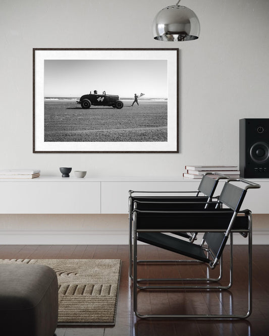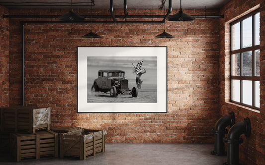 Fine Art Print - Vintage Hot Rod Beach Race with Flag Girl, Black and White Wall Art, Racing Decor for Men