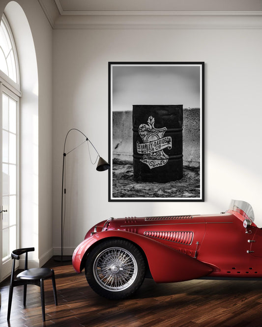 Fine Art Print - Harley Davidson Barrel Wall Art | Black & White Motorcycle Garage Decor | Photography Print for Biker Mancave Decor