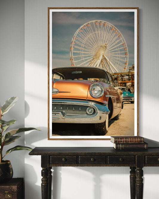 Fine Art print - Classic Oldsmobile Americana Cruiser Ca Wall Art, Ferris Wheel, Boardwalk, Vintage Summer, Beach Coastal Decor, Gift for