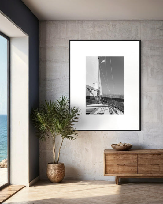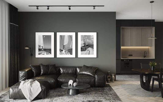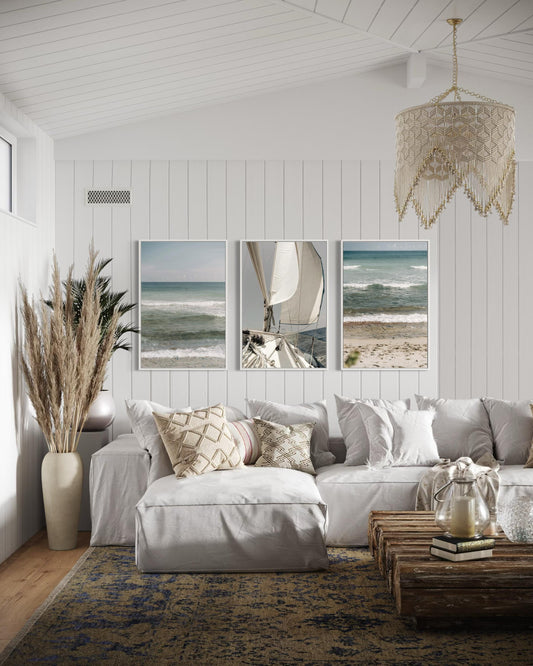 Fine Art Print - Coastal triptych wall art, set of 3 ocean waves and sailboat, for serene neutral decor, calm beach photo for coastal decor