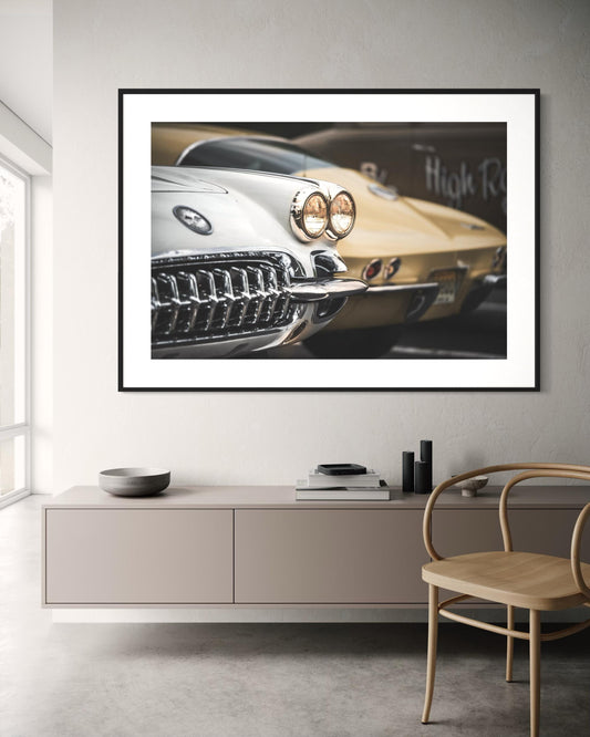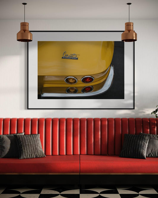 Fine Art Modern Vintage Corvette Sting Ray Wall Art - Yellow Energy Classic Car Photography Print - Minimalist Clean Sleek Decor Poster