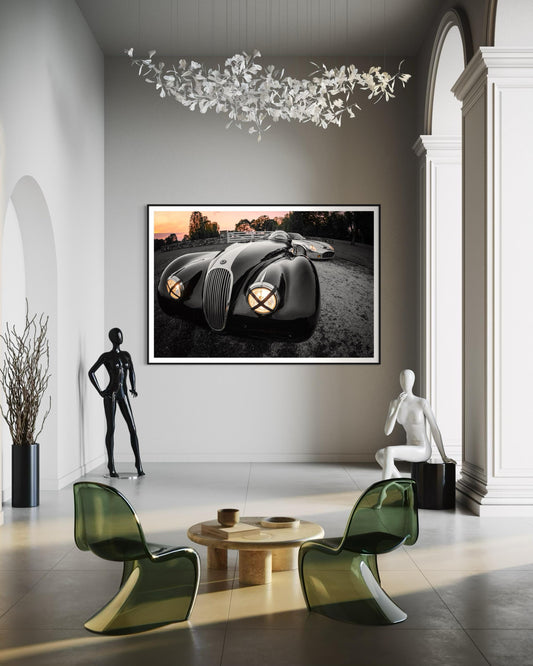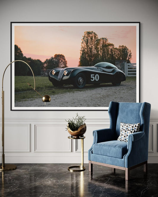 Fine Art Print - Sunset Art Deco Classic Jaguar XK120, The Black Cat, Runge Veleno Wall Art, Vintage Car, Garage Decor, Man Cave Decor, gift