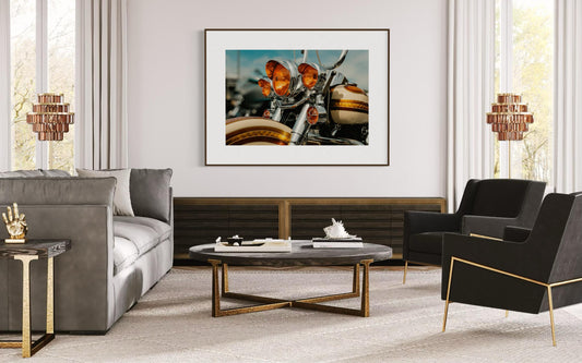Classic Harley Davidson Motorcycle Chrome and Amber Lights Wall Art, Retro Bike Photography Print, Unique Decor for Biker Enthusiasts