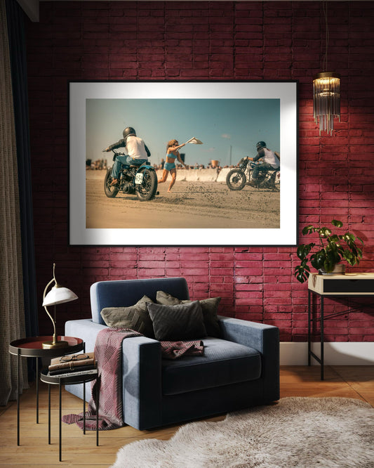 Fine Art Print - Flag Girl & Vintage Motorcycle Race Start - Beach Drag Racing Wall Art - TROG Poster, housewarming gift, garage, man cave
