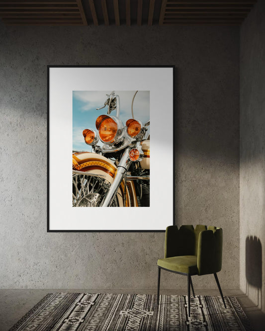 Fine Art Print - Motorcycle Chrome and Amber Lights Wall Art, Vintage Harley Davidson Print, Poster, man cave, garage, or office decor gift