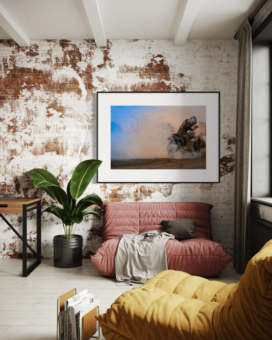 Fine Art Print - Dusty Dreamscape Motorcycle Stunt Biker Burnout Colorful Energy Mood Minimalist Abstract, Biker Gift Ideas, garage decor