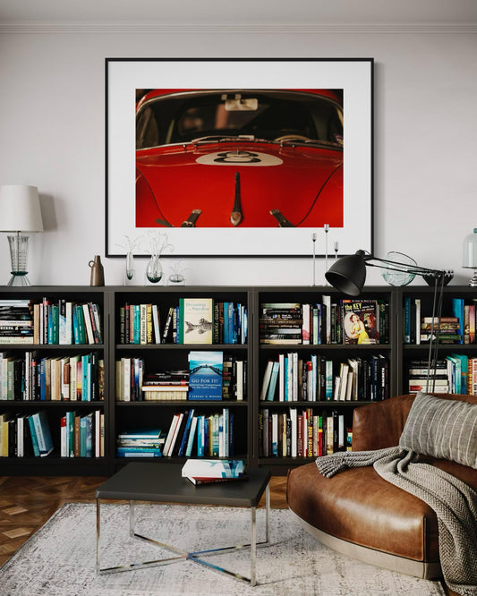 Fine Art Print - Classic Red Porsche 356 Hood Close-Up - 8 ball - Classic Racing Wall Art Poster, for car decor, garage, or office spaces.