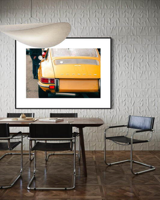 Fine Art Print - Vintage Porsche 912 rear giclee Wall Art, mustard yellow classic sports car poster for garage, lounge, office, modern decor