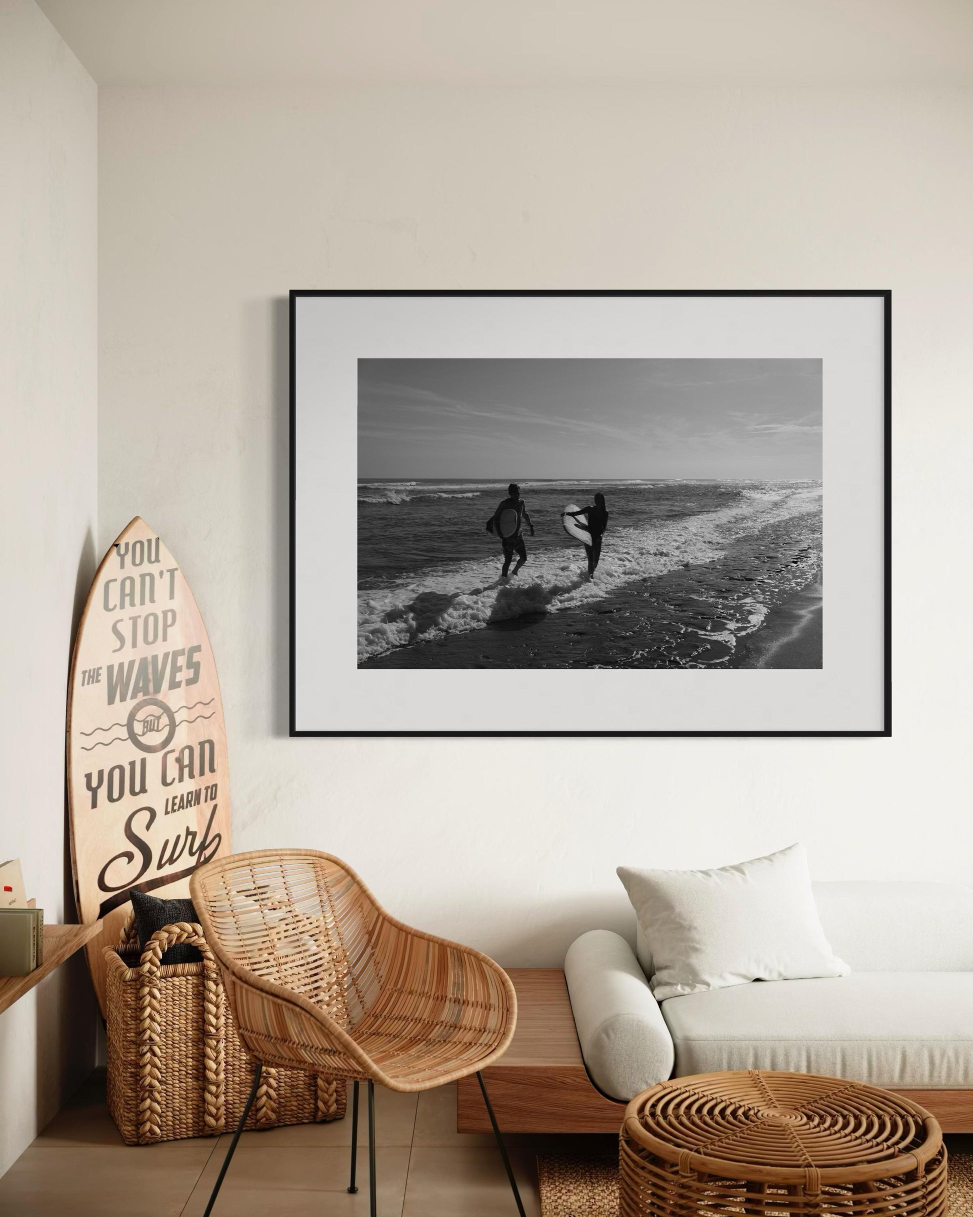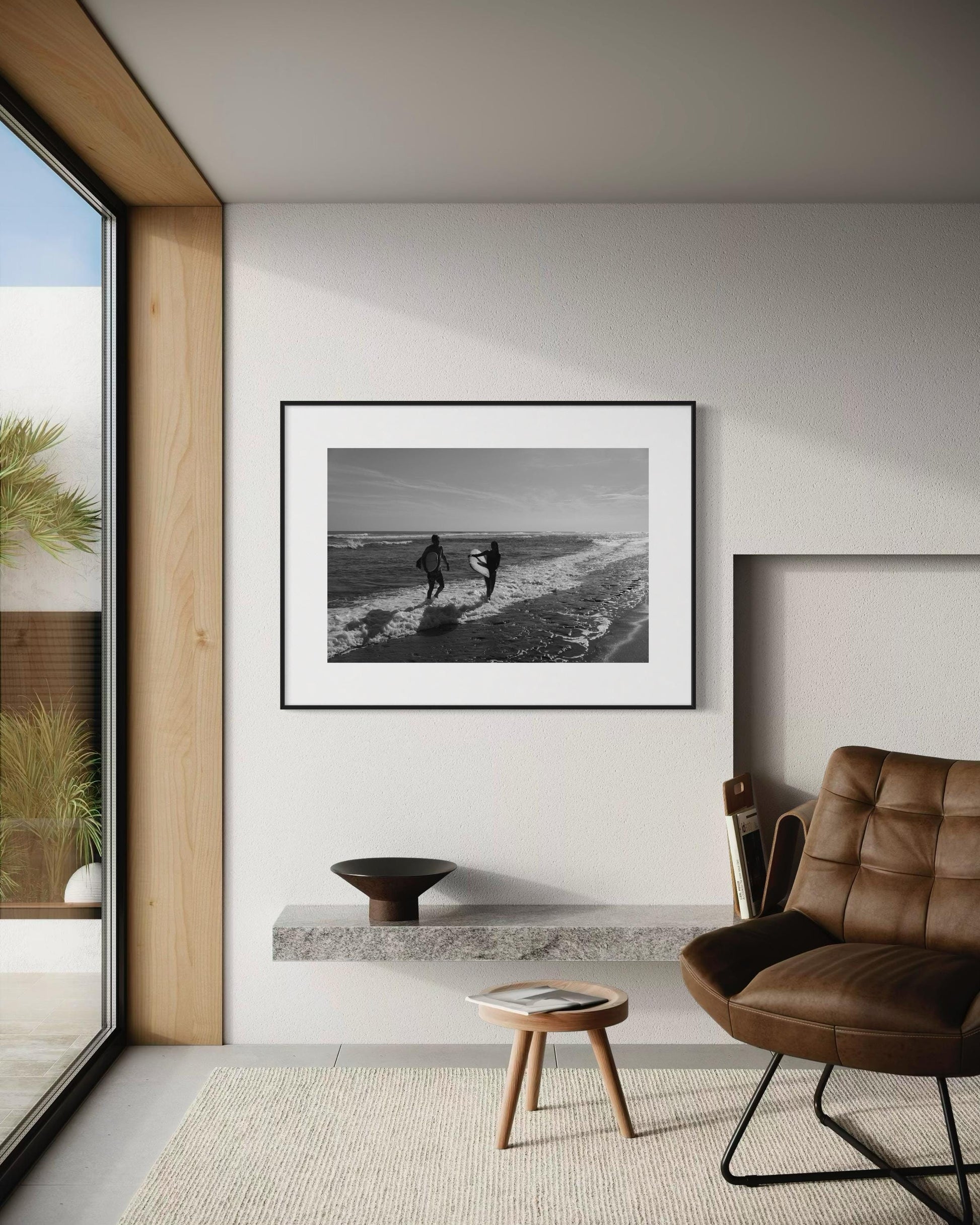 Capture the beauty of surf culture with this stunning black-and-white photograph of two surfers stepping out of the waves. The timeless aesthetic and serene coastal vibe make it a perfect addition to any beach-inspired space or modern interior. 🌊🏄‍♂️🏄‍♀️